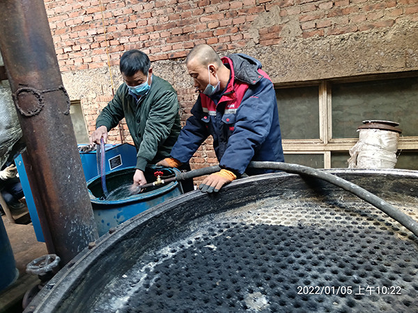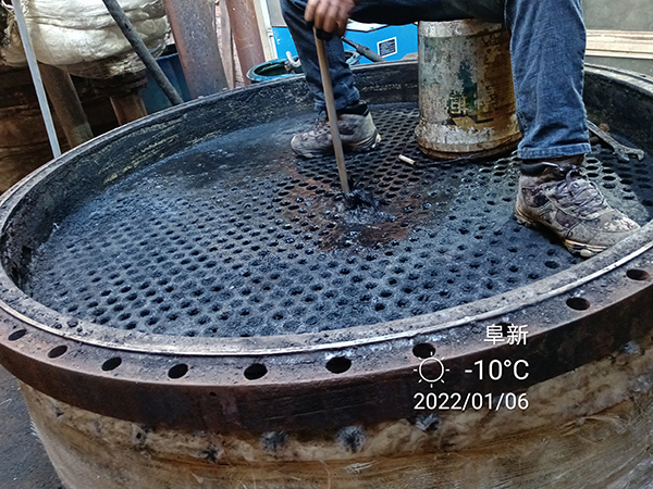 2022年1月24日星期一,虎年(農(nóng)歷臘月二十二)大寒季節(jié),室外時溫零下—16℃,遼寧省彰武縣興隆山鄉(xiāng)老虎坨子村,阜新市彰武縣達(dá)凱化工有限公司糠醛廠,在高經(jīng)理的精心安排下,蘇振山廠長給我們指導(dǎo),積極與我們河南都市機(jī)械設(shè)備有限公司喬俊陽技術(shù)員配合,改制了一款寬槽橡膠滑輪,對結(jié)垢堅硬,徹底燒干堵死的廢水蒸發(fā)器管子進(jìn)行疏通,清理,經(jīng)過實驗,既節(jié)省了人力,又安全,又快捷,確實是值得分享的好辦法!